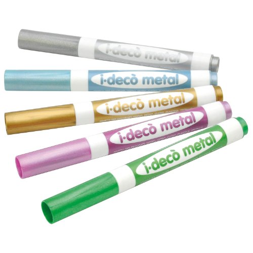 Glanzvolle Effekte ... zaubern die Metallic-Stifte auf glatten Oberflächen wie Glas, Kunststoff, Metall - aber auch auf Holz oder Papier. Die Filzspitze ist sowohl für feine Linien als auch für Flächen geeignet. 5 wasserlösliche, geruchlose Farben: Gold, Silber, Blau, Grün, Rotviolett. Tipp: Saugfähige Untergründe vorher mit weißer, wasserfester Farbe grundieren. Maße: 14 cm lang. Ab 3 Jahre.